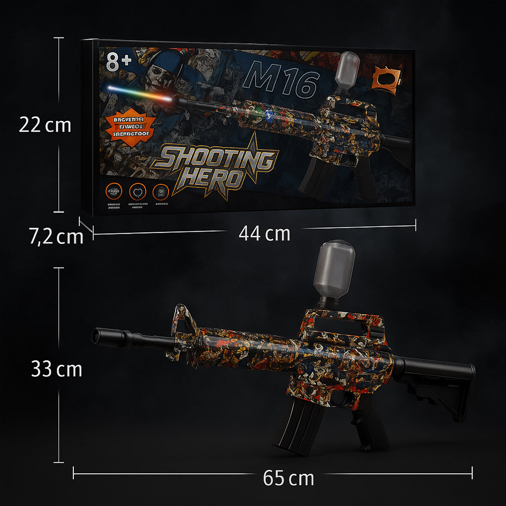 Bring das Spiel auf die nächste Stufe mit der M16 Shooting Hero SR082B Gel Blaster Gun! Diese farbenfrohe Wasserperlen-Gun kombiniert coole Grafiken, realistisches M16-Design und leuchtende Effekte – perfekt für Kinder und Erwachsene, die actionreiches Spiel lieben.