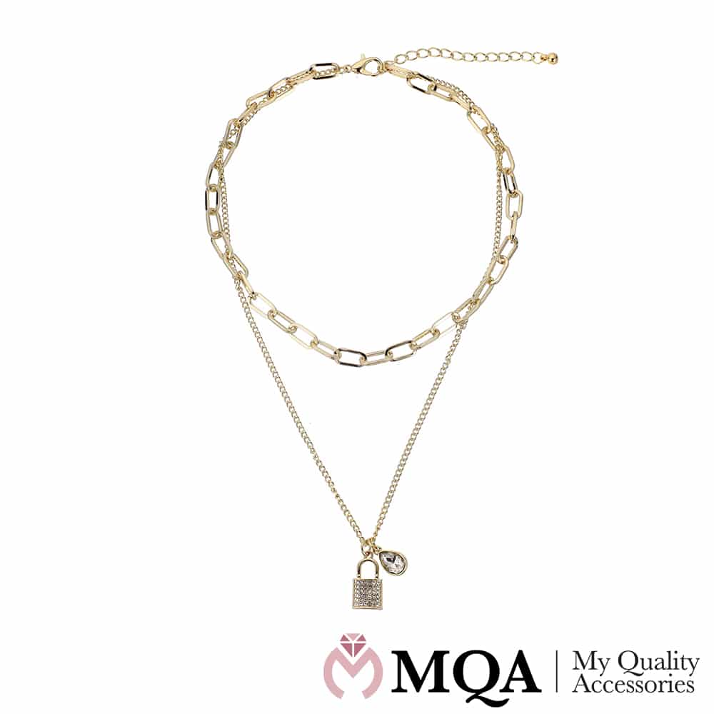 Goldfarbene Doppelkette mit süßem kleinen Anhänger, der mit großen klaren Glassteinen verziert ist. Neben dem Herz befindet sich ein Vorhängeschloss, das mit kleinen Glassteinen verziert ist. Der Anhänger wird mit einer schönen dünnen Kette geliefert. Außerdem besteht der Schmuck aus einer breiten Kette mit vielen Gliedern. Das Schmuckstück ist mit einem Karabinerverschluss ausgestattet und aus Metall von starker Haltbarkeit zu einem guten Preis hergestellt.