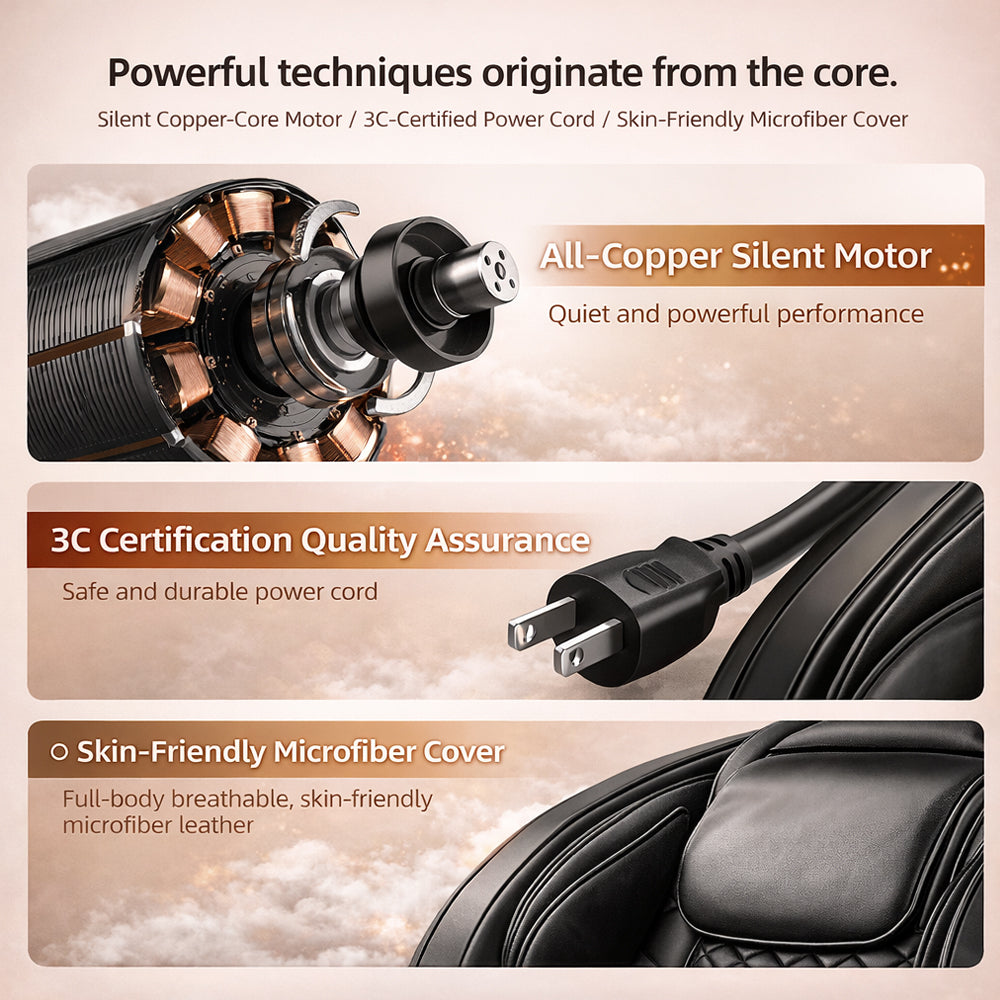 Der Sessel ist mit 22 Airbags an Schultern, Armen, Hüften, Waden und Füßen ausgestattet. Die Luftdruckmassage arbeitet mit rhythmischem Drücken-und-Lösen und bietet 3 Stufen, die die Durchblutung anregen und helfen, Verspannungen zu lösen – besonders effektiv nach langen Tagen mit sitzender Tätigkeit.