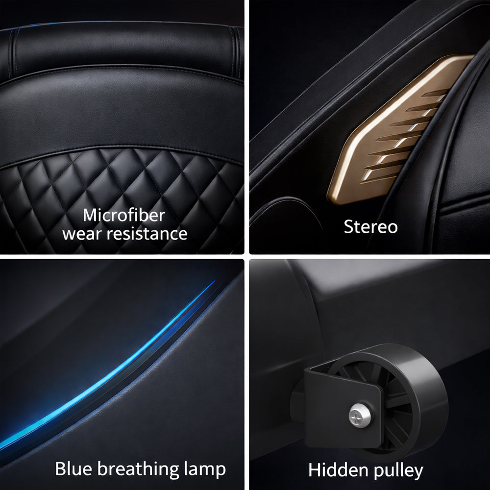 Elegantes Design aus hochwertigem PU-Leder mit gesteppter Rückenpartie, integrierter LED-Beleuchtung („Blue Breathing Lamp“) und verdeckten Transportrollen.