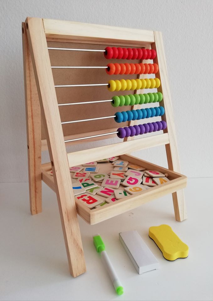 Die Rückseite hat einen Kugelrahmen (Abakus) der Ihrem Kind hilft, seine Rechenfähigkeiten zu verbessern, und auf der weißen Seite kann es mit magnetischen Zahlen und Buchstaben rechnen und darauf schreiben.