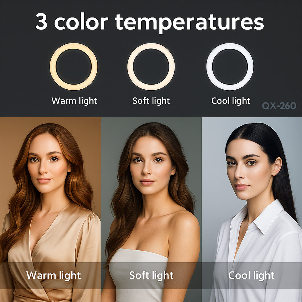 Die Ringlampe verfügt über 3 Lichtmodi (kalt, warm und weich) sowie eine stufenlose Helligkeitsregelung. So kannst du das Licht problemlos an die Umgebung anpassen und den natürlichsten Look erzielen – ganz ohne zusätzliche Filter.